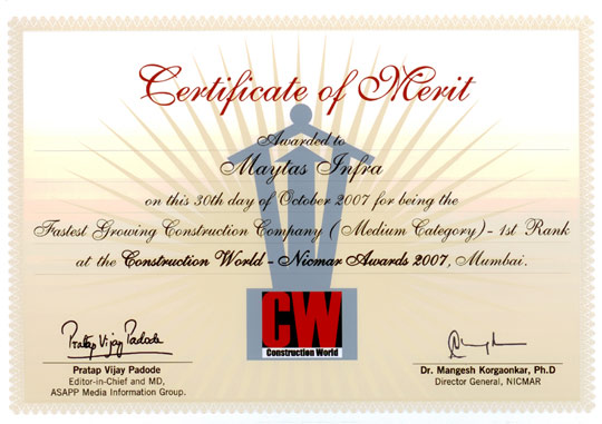The advisory panel included experts from NICMAR, Business India, Dalal Street Journal, Kotak Mahindra Bank, Hiranandani Developers Pvt. Ltd, K Raheja Universal Pvt. Ltd, Investment Advisors Ltd and The Indian Hotels Company. The award was presented to Mr. P.K.Madhav, CEO, Maytas Infra by Dr. T. Subbirami Reddy, Union Minister of State for Mines.